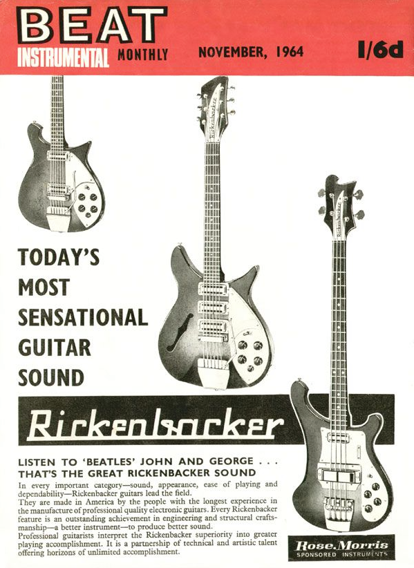 A Rickenbacker Guitars full page ad via Rose Morris, on the cover of Beat Instrumental Monthly in November 1964