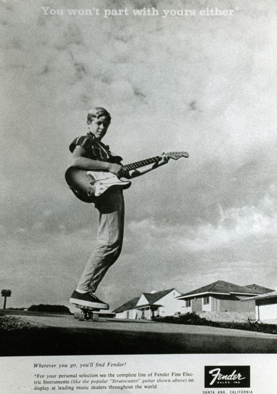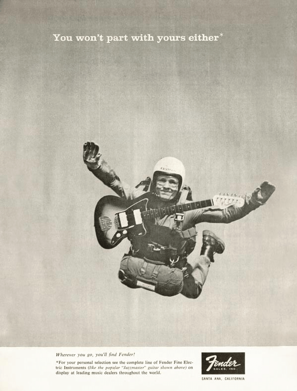 His highly successful “You Won’t Part With Yours Either” campaign depicted people carrying Fender guitars and amplifiers in a host of unlikely to outrageous settings—while scuba diving, surfing, skydiving, skiing and other adventurous situations.